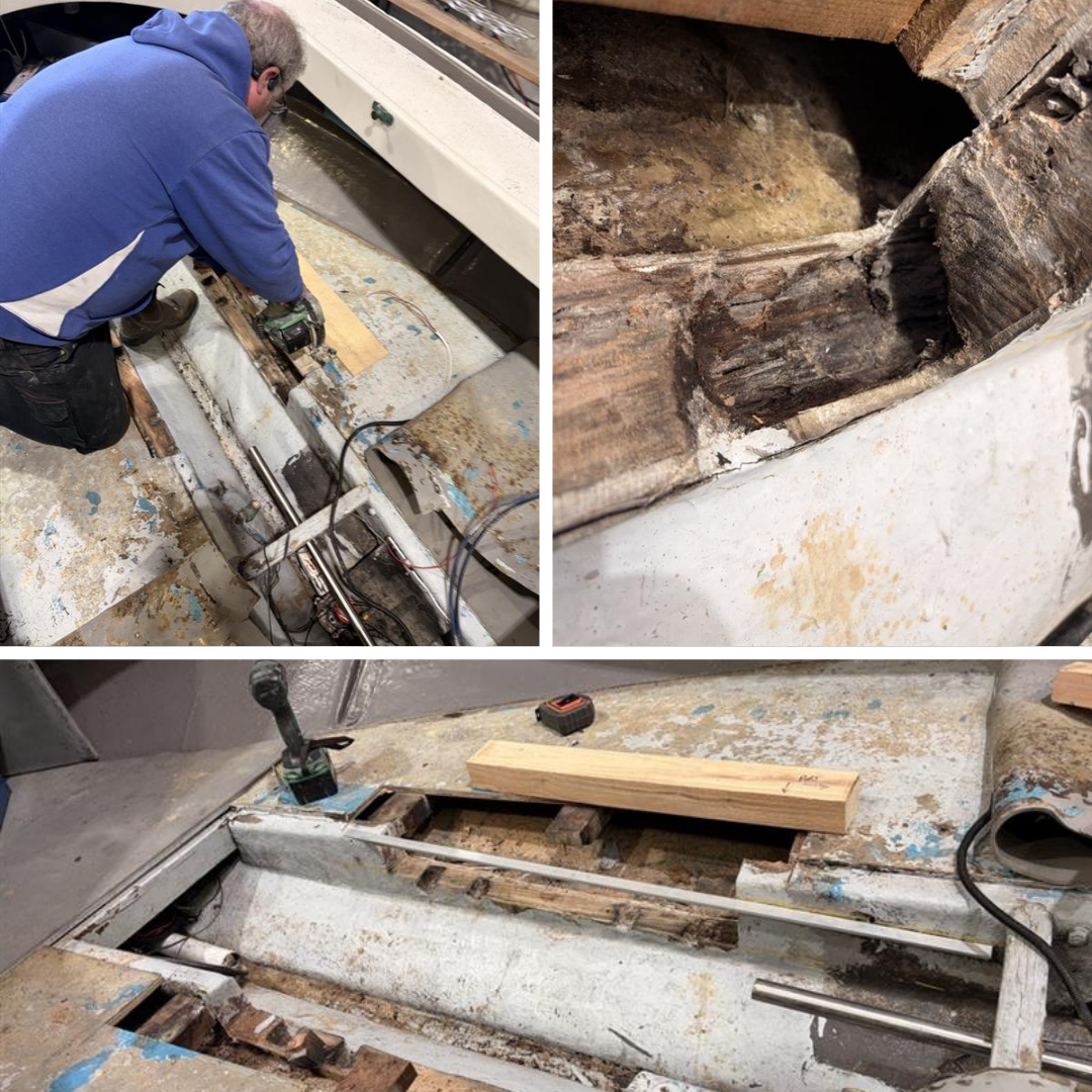 The first day was dedicated to removing the old engine, gearbox, shaft and running gear for inspection. Once the components were out, it became clear the new Volvo Penta D1-20 marine engine would need to sit higher on the engine beds to achieve correct shaft alignment. Further inspection revealed extensive rot in the original timber stringers.